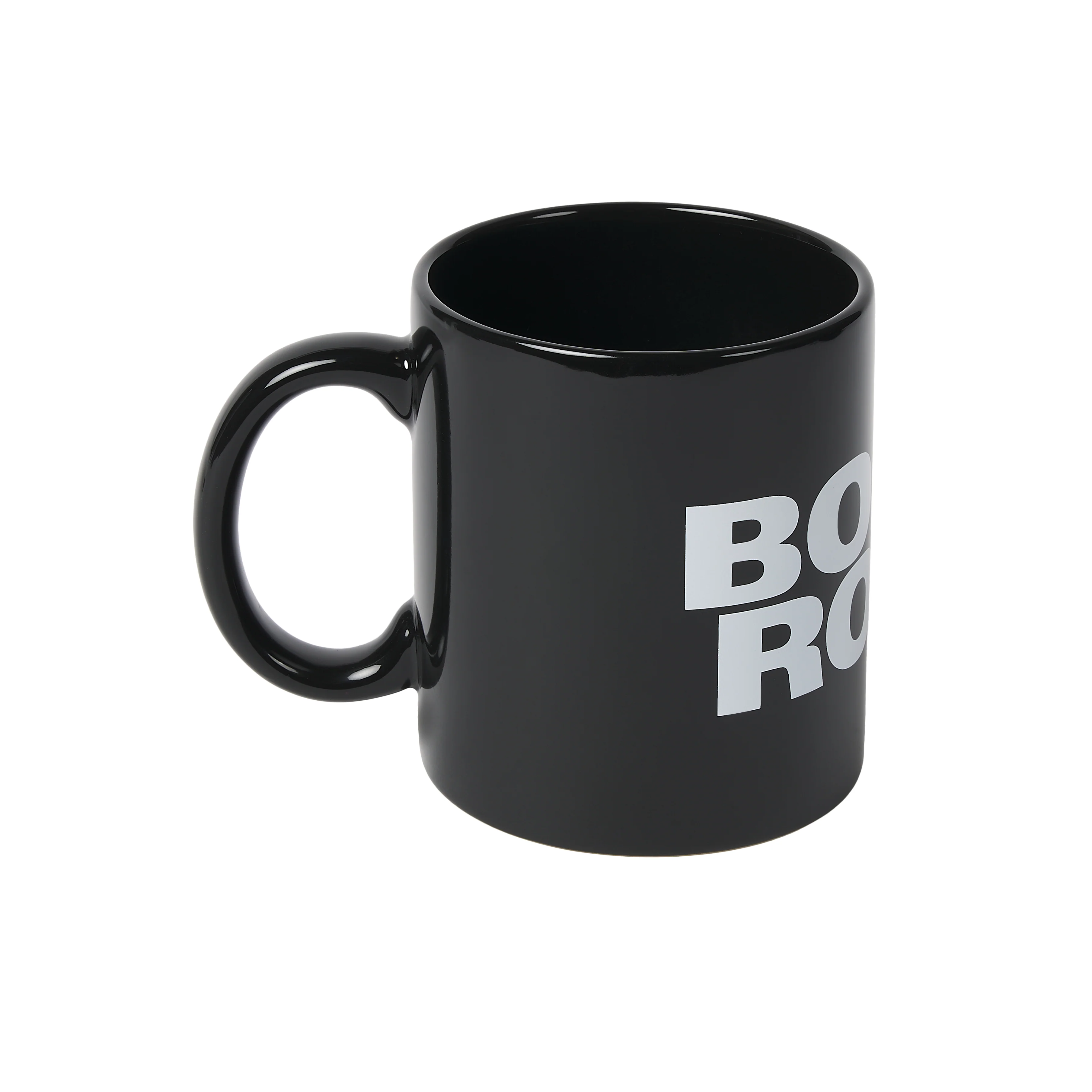 All black ceramic mug with large white printed logo.