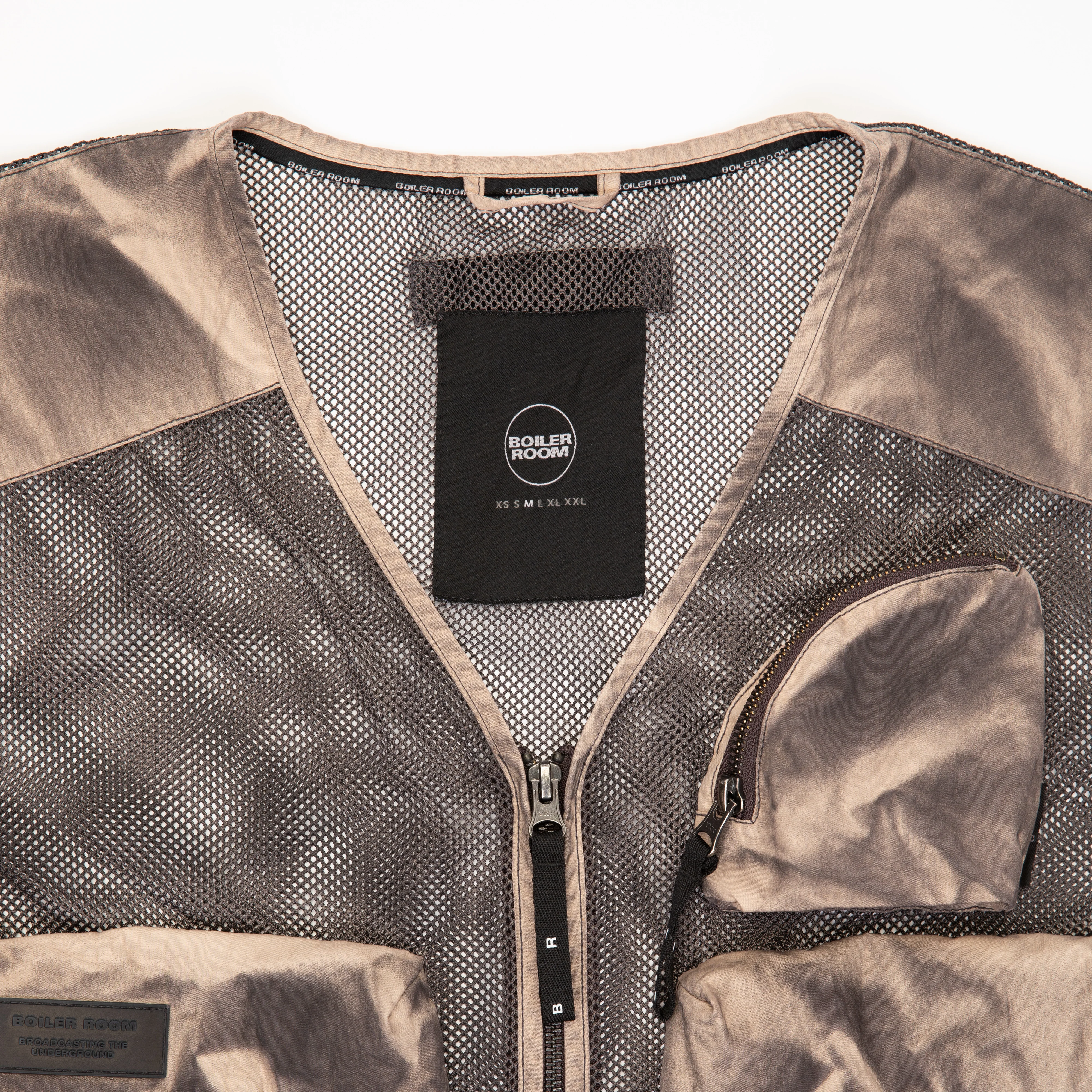 Sleeveless utility vest with multiple front pockets on reinforced mesh fabric.